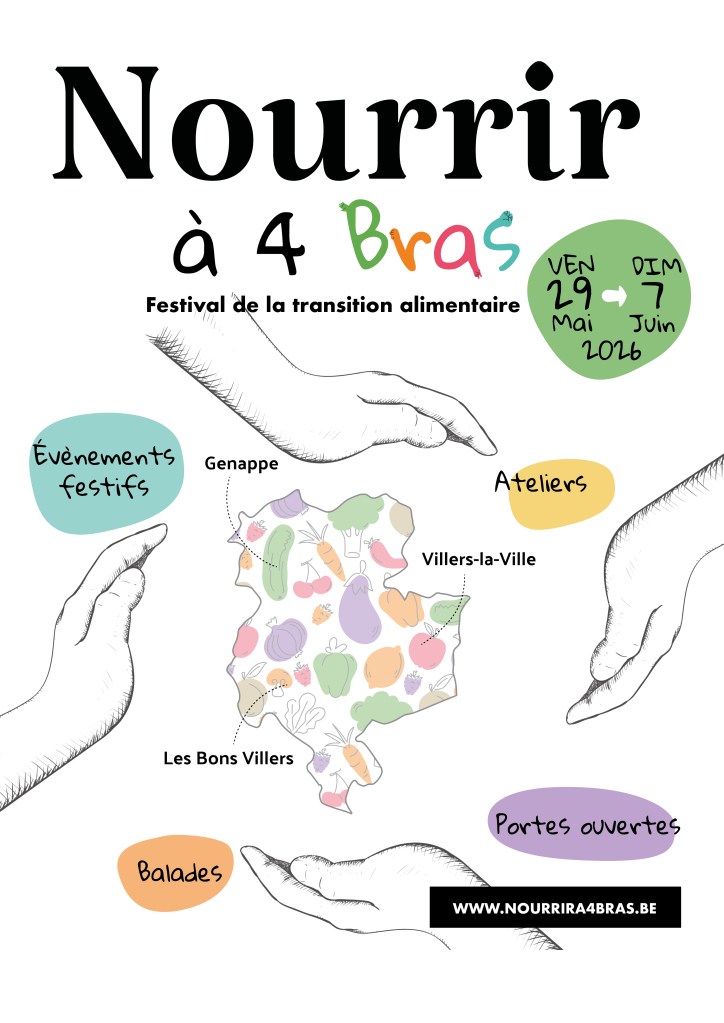 Et si on repensait notre façon de produire et de consommer ? C’est tout l’enjeu du festival Nourrir à 4 Bras, qui revient pour sa 2e édition, encore plus riche et engagée, du 16 au 25 mai 2025. Coordonné par Le MONTY et Agricoeur, ce festival se déroule sur 10 jours à Genappe, Villers-la-Ville et Les Bons Villers, pour questionner notre système alimentaire et découvrir des solutions locales, durables et inclusives. Cette année, il prend de l’ampleur avec plus de 30 partenaires parmi des productrices et producteurs, des associations, des collectifs, des coopératives, des écoles, des mangeuses et des mangeurs comme vous et nous, des bénévoles.